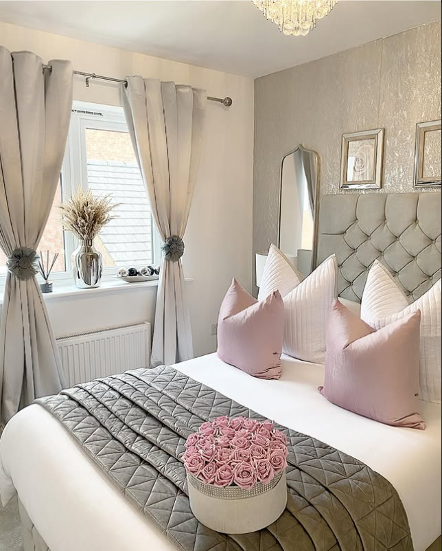 Soft blush pillows, quilted bedding, and shimmering curtains create a cozy yet glamorous retreat.
