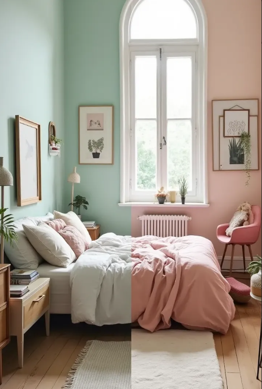 Using two different wall colors and coordinated decor, each side feels personalized while keeping the space balanced and stylish.
