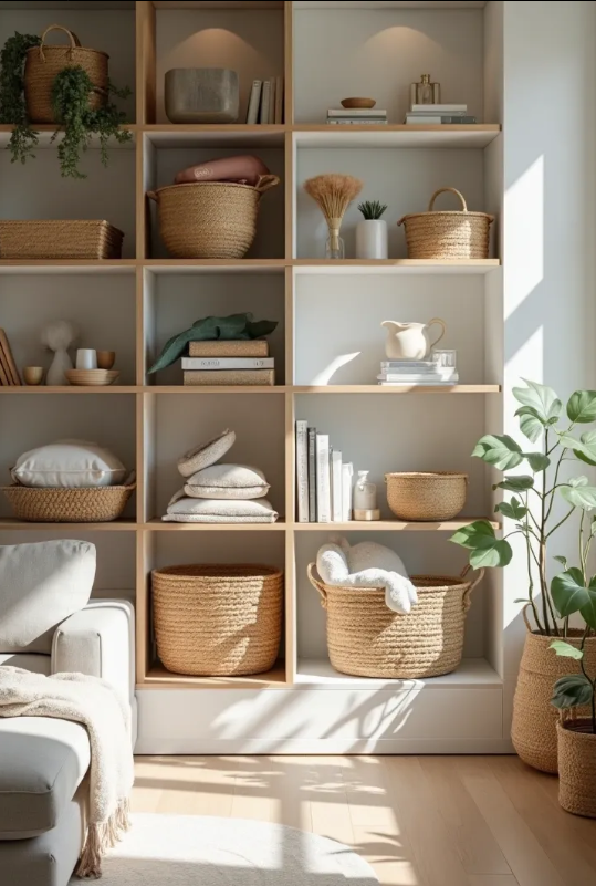 Perfect for storing blankets, books, and decor, this setup combines functionality with a cozy, minimalist aesthetic.