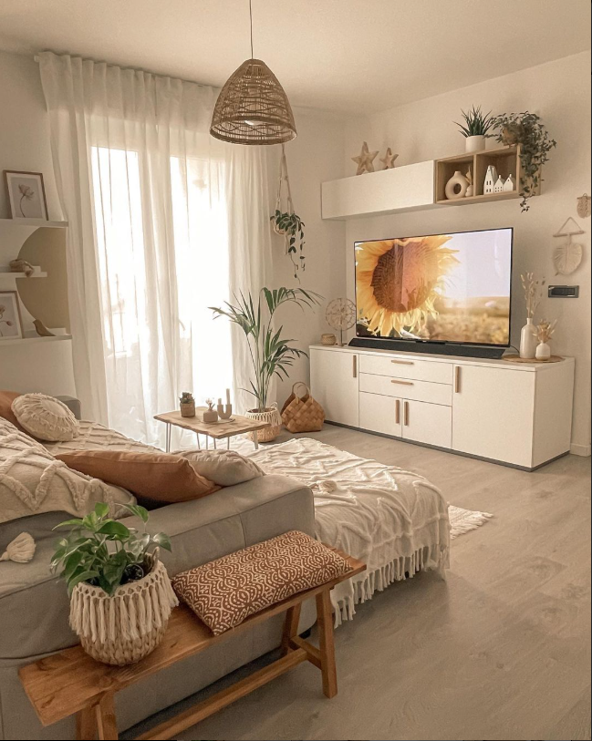 The natural wood coffee table, airy curtains, and indoor greenery add that effortless boho charm every home craves.