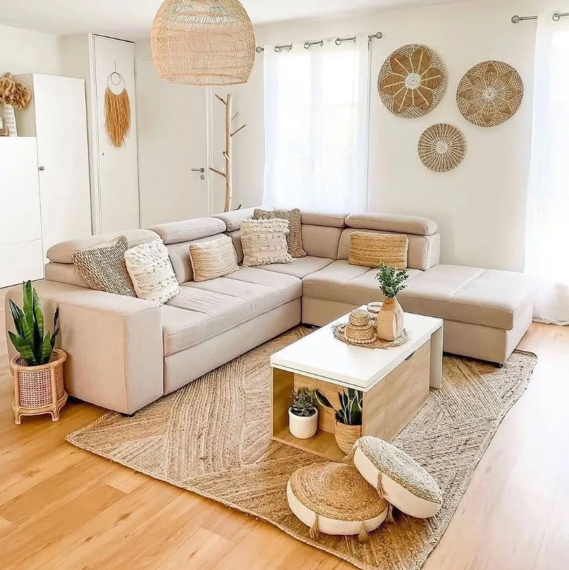 The oversized sectional, jute rug, rattan wall decor, and earthy pillows create a calming, sunlit space that feels both modern and welcoming.