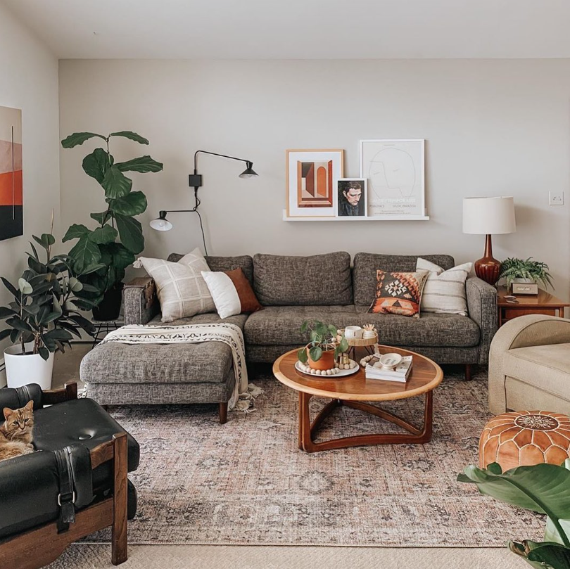 The charcoal sectional, warm wood coffee table, and patterned rug set the foundation, while terracotta pillows, indoor plants, and wall art add personality and depth.