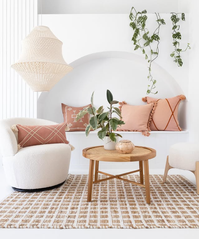 This bright boho nook blends soft neutrals with warm peach tones for a look that feels effortlessly calm and stylish.