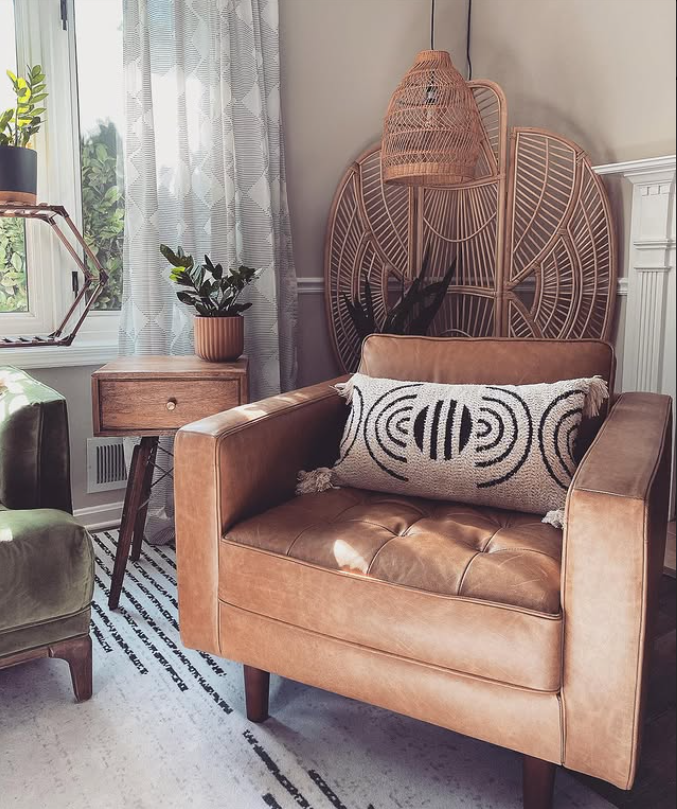 This cozy boho seat mixes warm leather tones with earthy textures for the perfect relaxed nook.