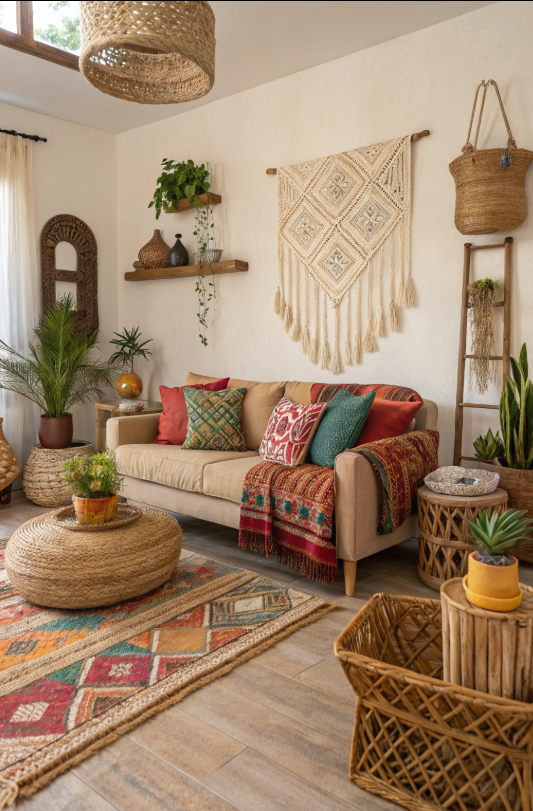 Layered pillows, patterned throws, and a bold rug bring lively color, while rattan pieces, hanging macramé, and lush plants add grounding organic charm.