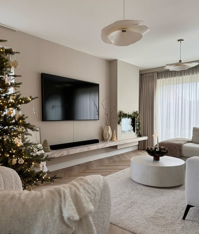 This beautifully styled Christmas living room mixes modern minimalism with festive warmth.