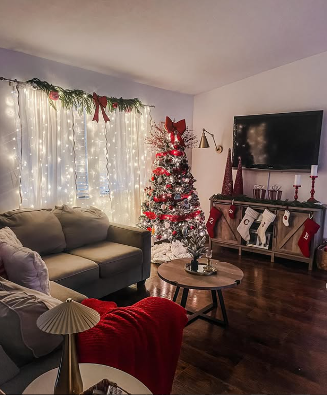 This festive living room is glowing with holiday warmth, combining soft string lights, lush garlands, and a beautifully decorated red-and-white Christmas tree.