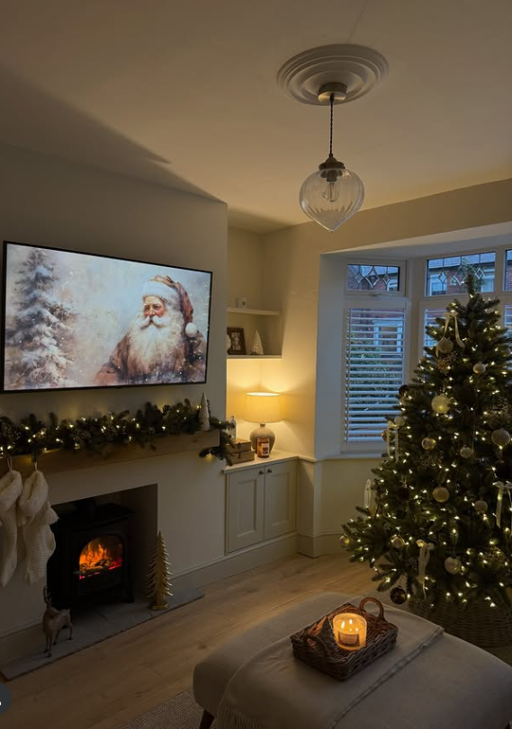 A classic Christmas movie playing on the TV adds an extra touch of comfort, making the whole space feel joyful, relaxed, and full of seasonal spirit—ideal inspiration for creating a cozy Christmas living room you’ll love spending time in.