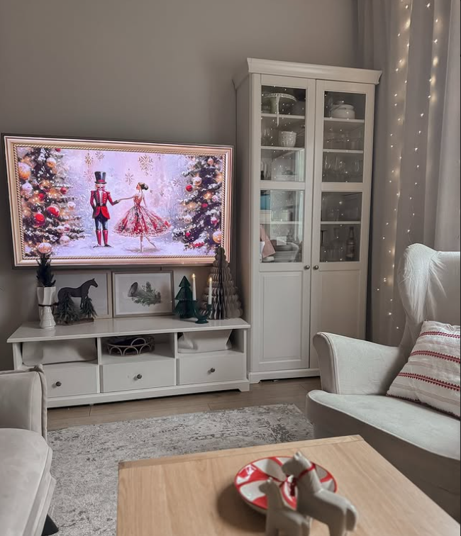 The Nutcracker-inspired scene on the TV adds a magical focal point, while the mini trees, warm candles, and twinkling curtain lights create a festive glow.