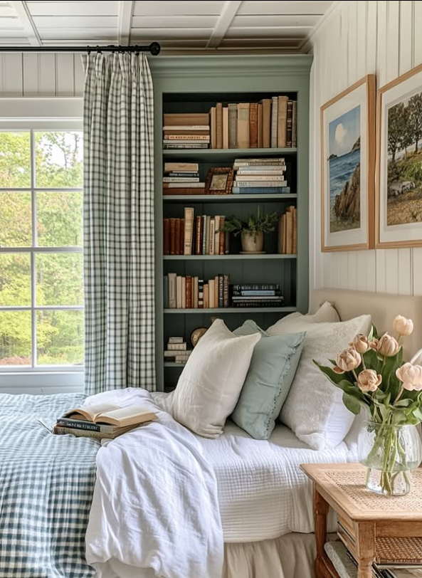 This cozy cottage bedroom captures pure retreat vibes with its gingham bedding, layered pillows, soft florals, and built-in bookcase filled with warm-toned reads.