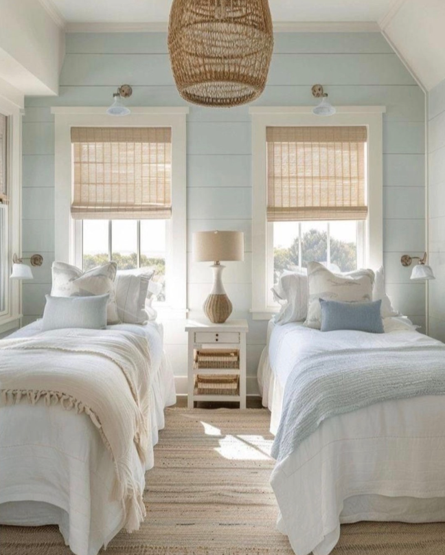 This serene cottage bedroom brings effortless coastal charm with its soft blue shiplap walls, woven textures, and cozy twin bed setup.