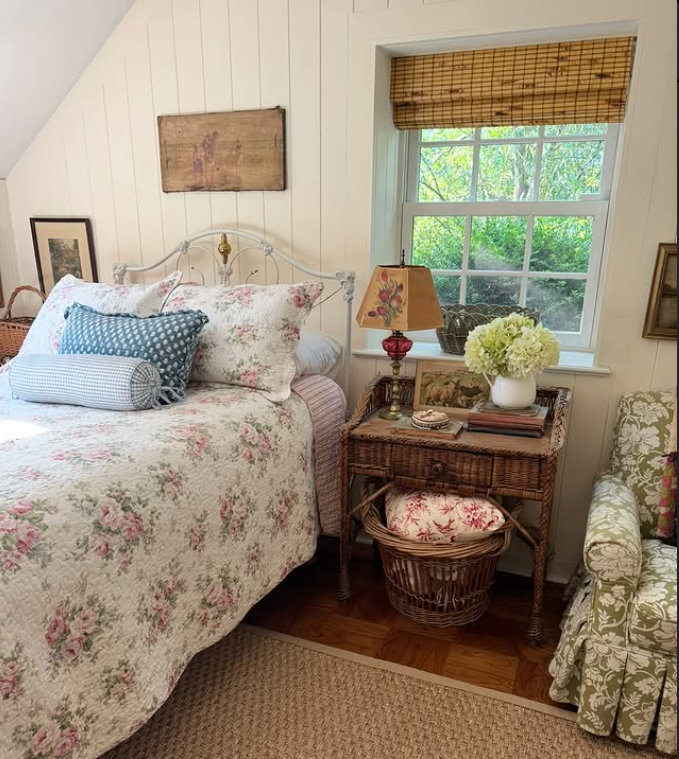 This cozy cottage bedroom is full of nostalgic charm, blending soft florals, textured linens, and warm wicker touches.