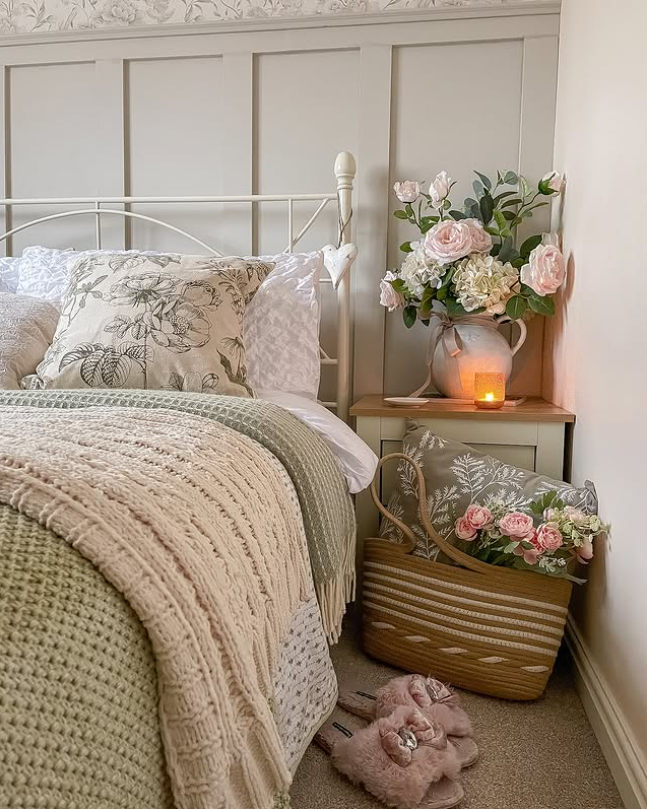 The knitted throws, botanical pillows, and fresh blooms create an inviting, romantic feel, while the candlelit nightstand adds that perfect touch of warmth.