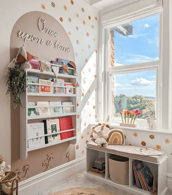 This charming children’s reading corner blends soft pastels, playful wall art, and a sunlit window to create a warm, imaginative hideaway.