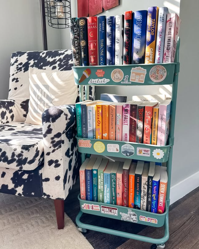 This vibrant rolling book cart creates a fun, flexible reading nook perfect for book lovers who want their favorites within arm’s reach.