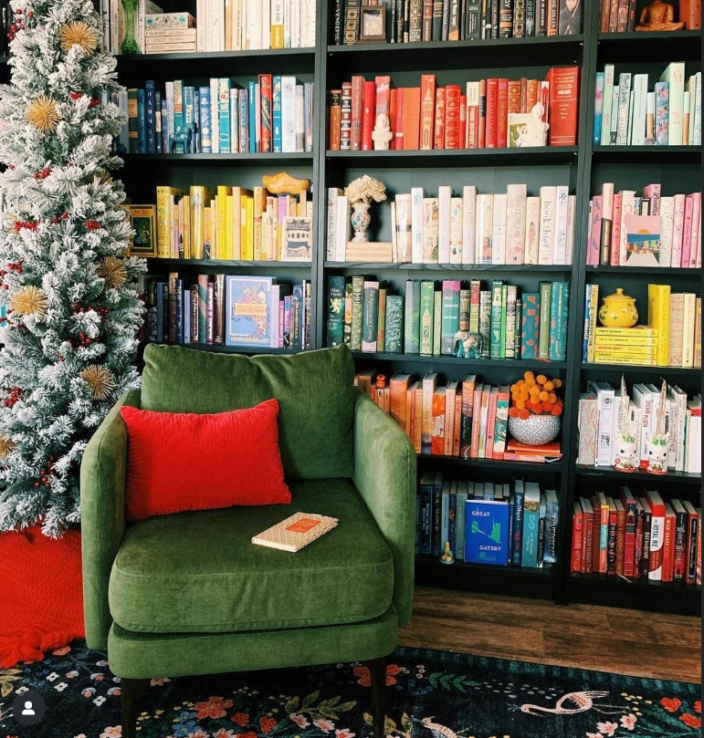 Paired with a soft rug and a festive tree, it’s a warm, inviting corner made for long reading sessions and holiday-season coziness.