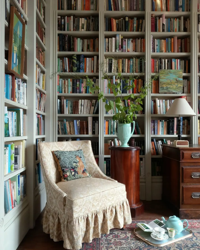 Floor-to-ceiling bookshelves create a library-like atmosphere, while the vintage skirted armchair and floral cushion add soft, traditional warmth.