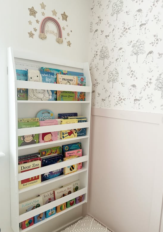 A darling children’s reading nook that blends soft pastels, whimsical wallpaper, and a perfectly curated front-facing bookshelf.