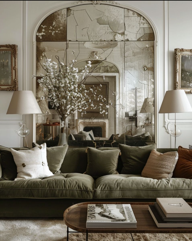 This beautiful living room showcases a warm, inviting winter aesthetic with its deep olive velvet sofa, layered neutral pillows, and a stunning antique-style mirror that adds instant elegance.