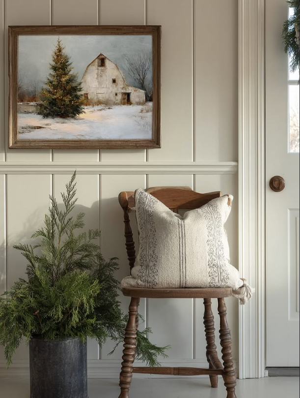The snowy barn artwork above ties the whole look together, giving the space a timeless, countryside-inspired Christmas feel—perfect for welcoming guests during the holiday season.