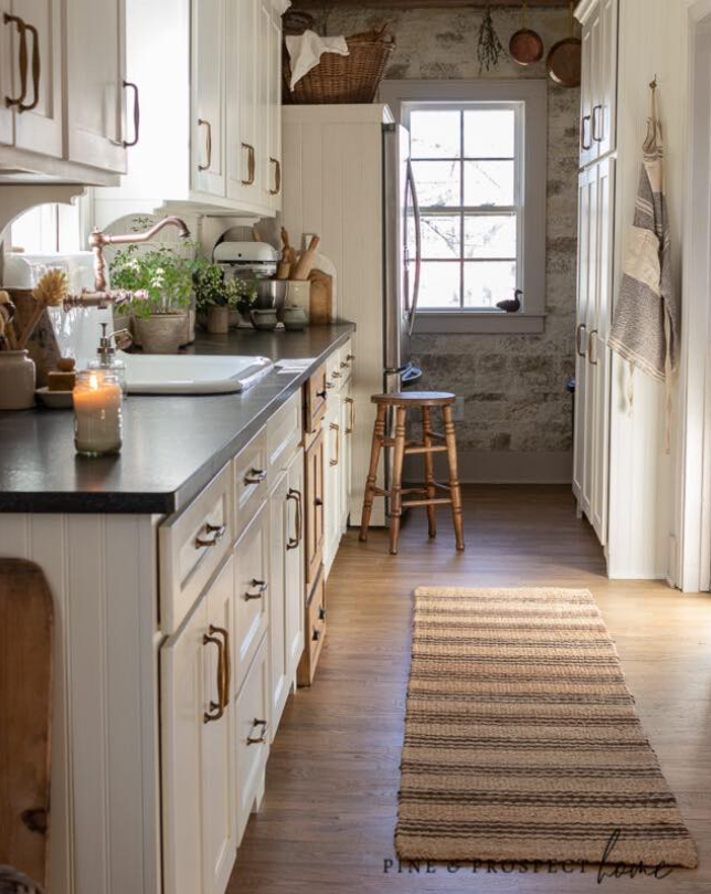 The cream cabinetry, woven rug, and rustic wood accents create an inviting, lived-in feel, while greenery and simple décor add a fresh seasonal touch.