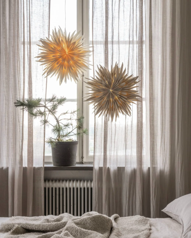 This peaceful Scandinavian-inspired bedroom features glowing paper star lights that bring a warm, magical winter ambiance to the space.