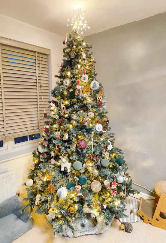 Layered with glowing lights, playful woodland ornaments, cozy textures, and a sparkling star topper, it creates a magical festive centerpiece.