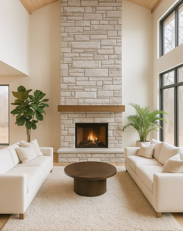 The tall stone fireplace creates a dramatic focal point, perfectly balanced by soft neutral sofas and a plush textured rug.