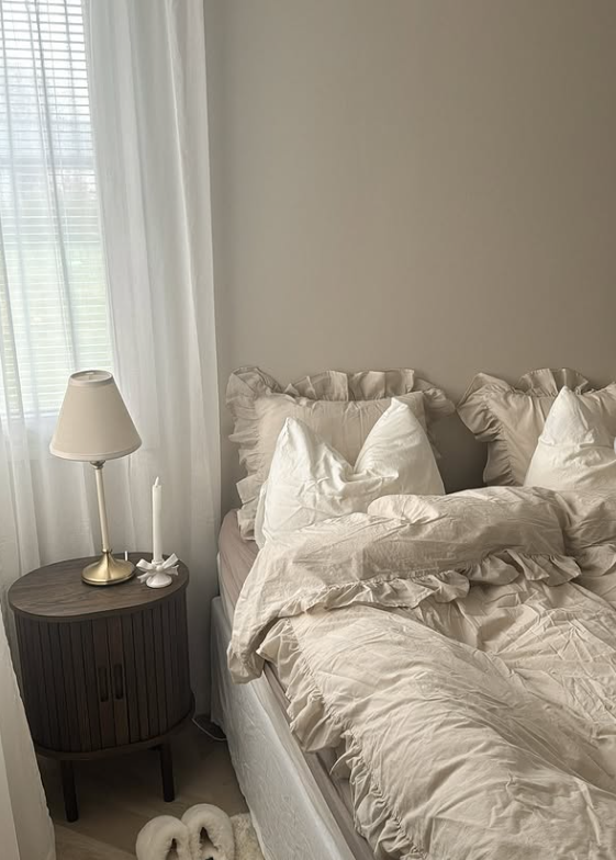 This serene neutral bedroom captures effortless coziness with its ruffled bedding, layered pillows, and warm taupe tones.