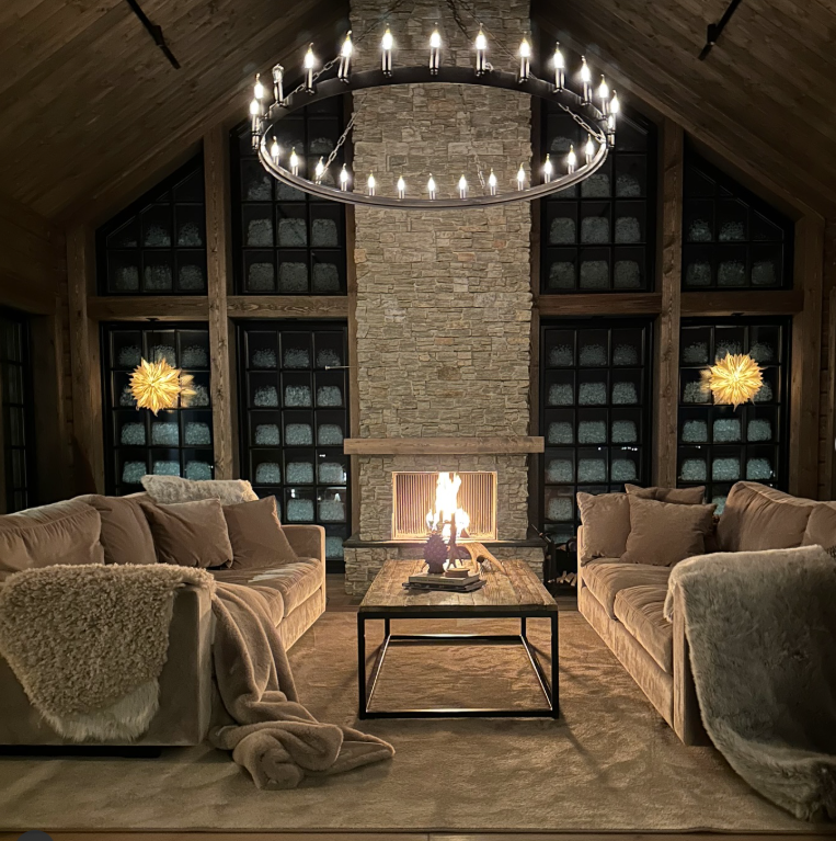 The circular chandelier and illuminated star decor add a magical glow, while the wood tones and large windows bring in that perfect mountain-lodge feel.