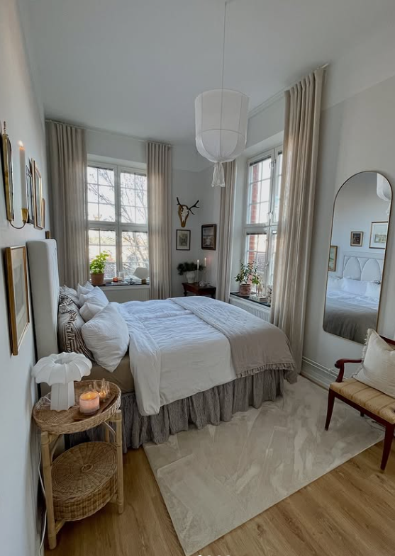 Layered bedding, warm wood accents, and thoughtfully placed plants add warmth and texture, while the tall curtains and arched mirror make the space feel open and airy.