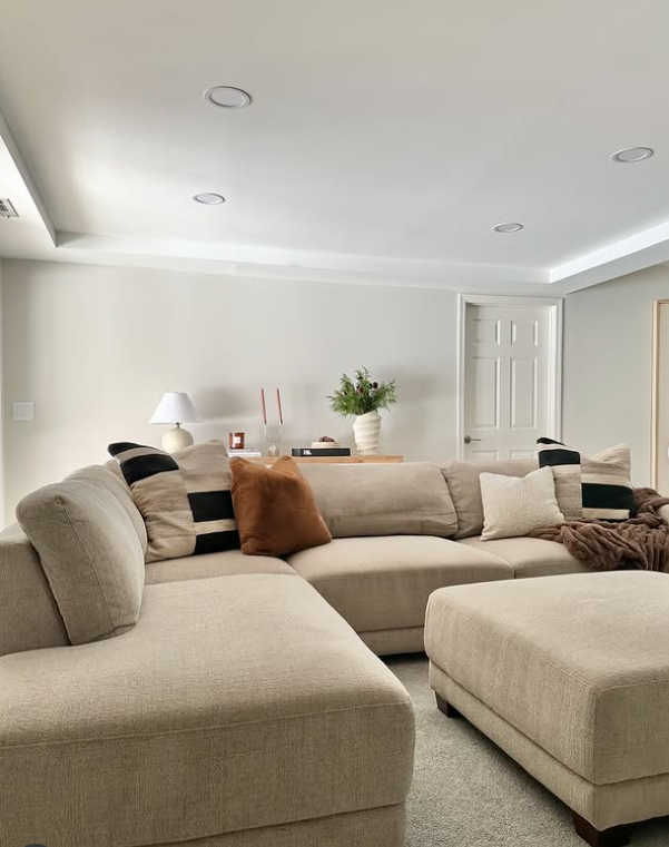 This soft and inviting winter living room uses warm neutrals, oversized seating, and layered textures to create a relaxed, comfortable atmosphere.