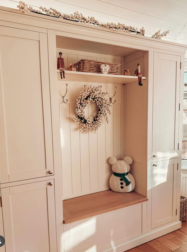 This cozy winter entryway uses soft neutrals, warm wood accents, and cute seasonal touches to create a welcoming, homey atmosphere.