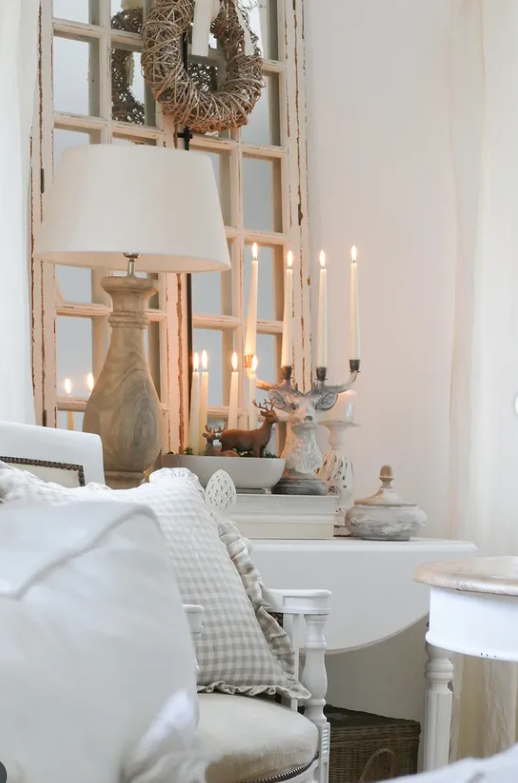 This beautiful winter vignette brings instant warmth to the home with its soft candlelight, rustic wooden accents, and layered neutral textures.