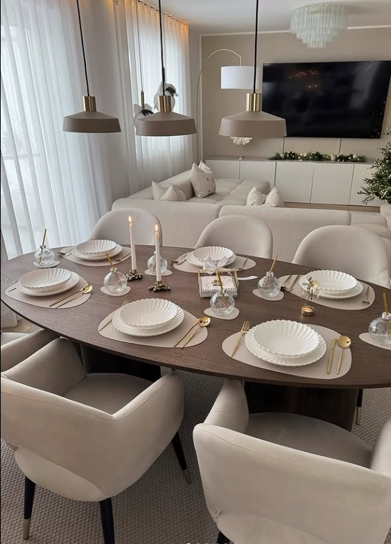 This beautifully styled winter dining area creates a warm, inviting atmosphere with its soft neutral palette, layered textures, and minimal yet elegant table setting.
