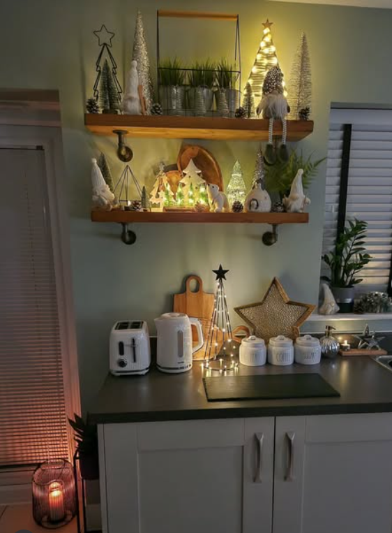 Create a warm winter vibe in your kitchen with soft ambient lighting, mini Christmas trees, and charming woodland accents.