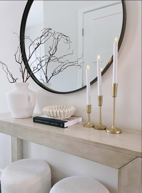 The glowing taper candles, soft gold accents, and organic branches add a subtle seasonal charm, while the round mirror and textured stools create a clean, cozy look.