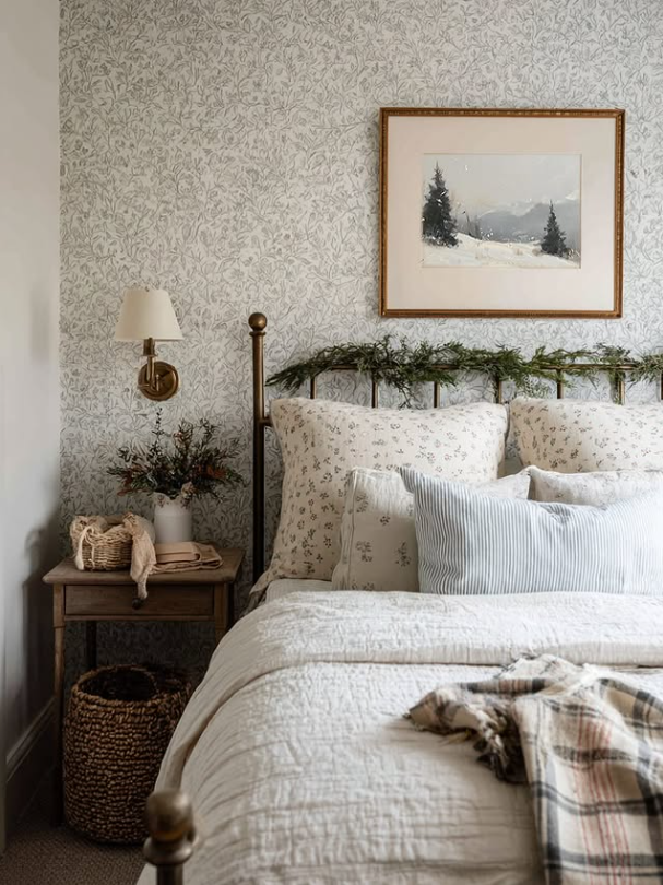 The floral bedding, plaid throw, and delicate wallpaper add a classic cottage feel, while the evergreen garland and winter artwork bring in a seasonal touch.