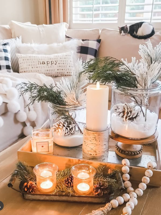 This cozy winter setup brings instant warmth to the living room with its glowing candles, frosted greenery, and soft neutral accents.