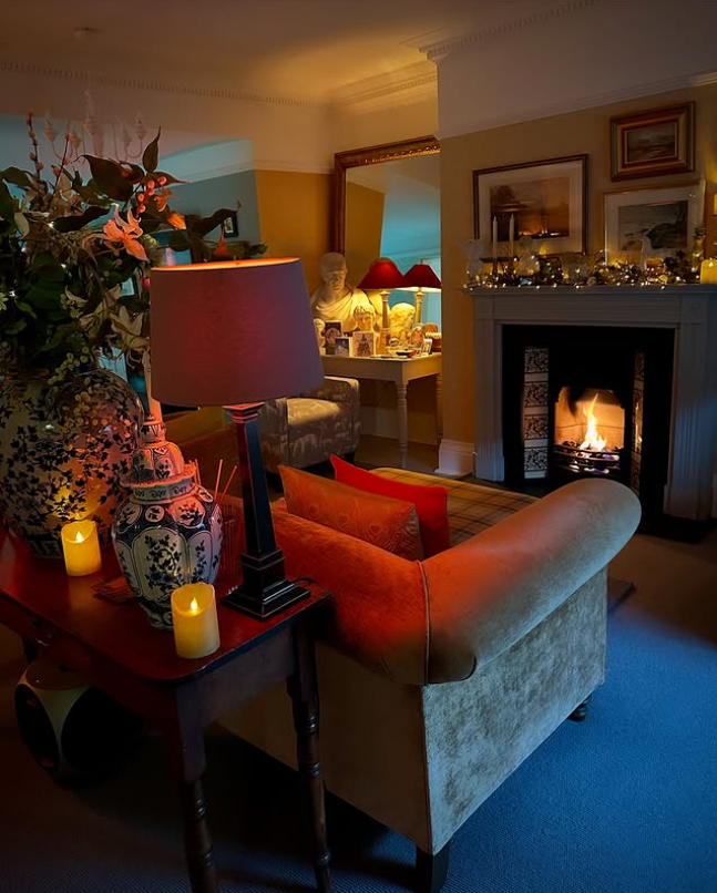 The mix of vintage decor, soft lighting, and plush seating adds an intimate, comforting feel, while greenery and subtle winter accents bring seasonal charm.