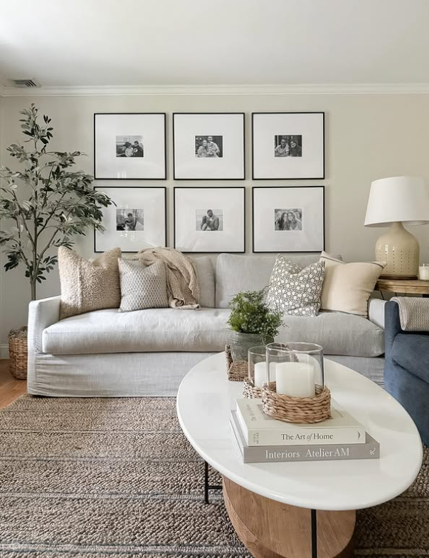 The gallery wall adds a personal touch, while the woven tray, candles, and simple greenery on the coffee table bring warm seasonal charm.