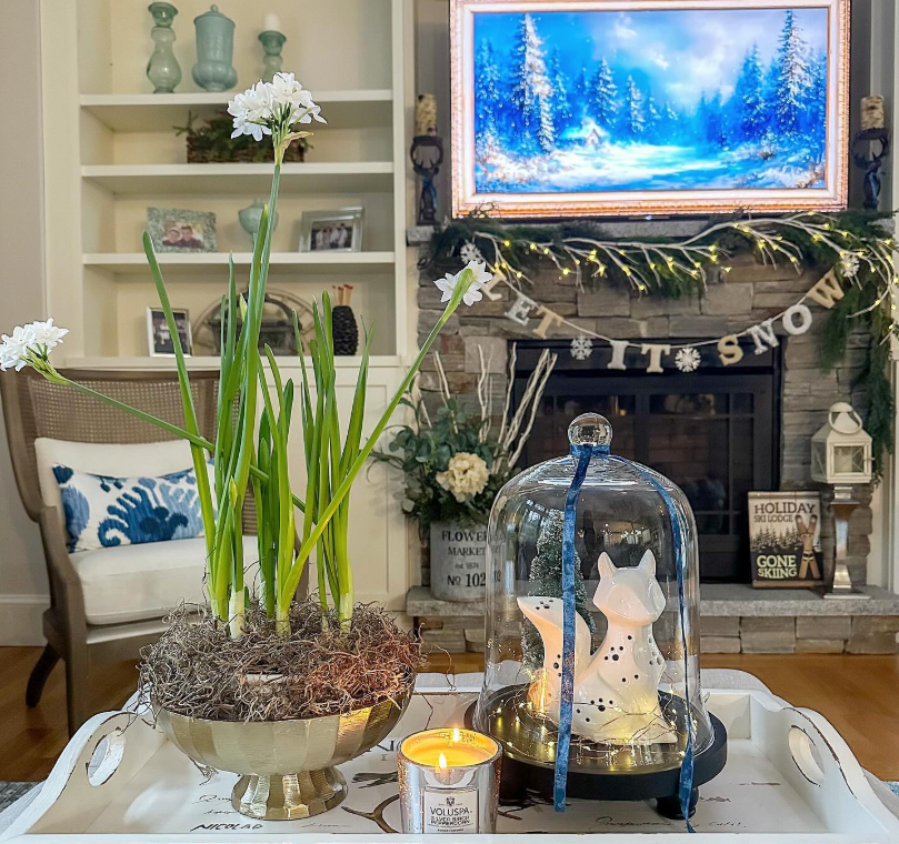The cloche display, glowing candle, and blooming paperwhites add warmth and texture, while the “Let It Snow” mantel garland and winter artwork create a festive focal point.