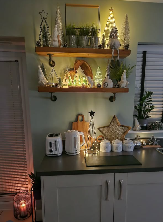 A perfect example of how simple winter touches can transform everyday kitchen corners into a warm seasonal retreat.