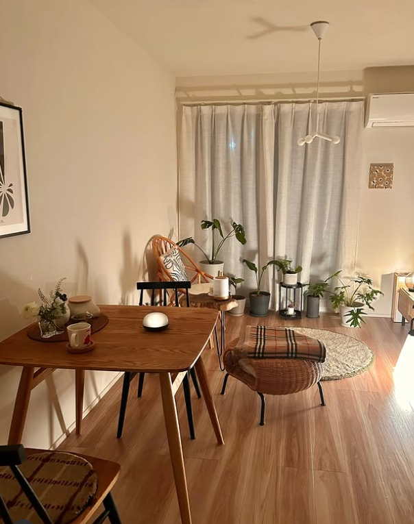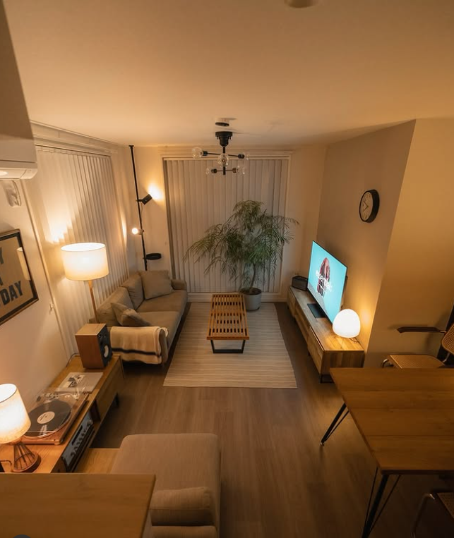 This cozy minimalist room combines warm wood furniture, soft layered lighting, and indoor plants to create a calm, inviting atmosphere.