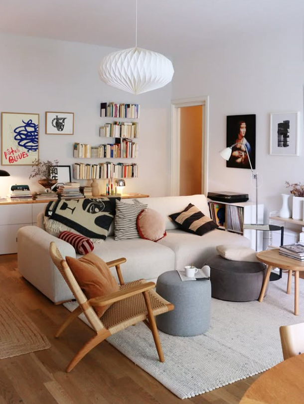 The mix of modern art, stacked books, and unique decor pieces gives the space personality, while the plush sofa, woven chair, and neutral rug keep it grounded and comfortable.