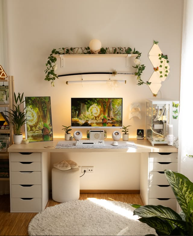 This warm, inviting setup blends soft ambient lighting, greenery, and clean white tones to create a cozy aesthetic workspace perfect for gaming or productivity.