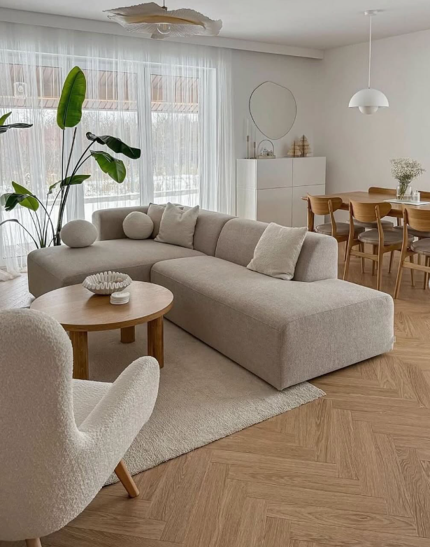 This serene neutral-toned living room captures the essence of a cozy, minimalist aesthetic.
