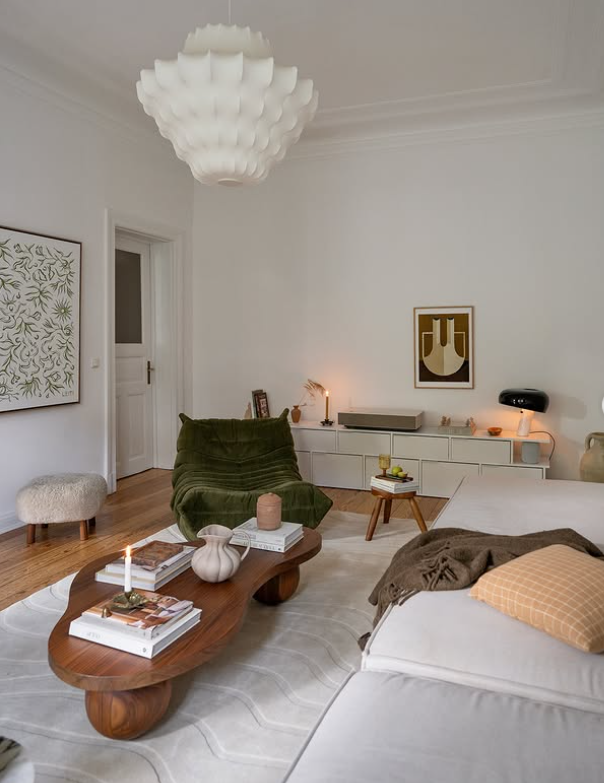 The sculptural wood coffee table, textured green lounge chair, and minimal decor pieces create a stylish yet comfortable feel.