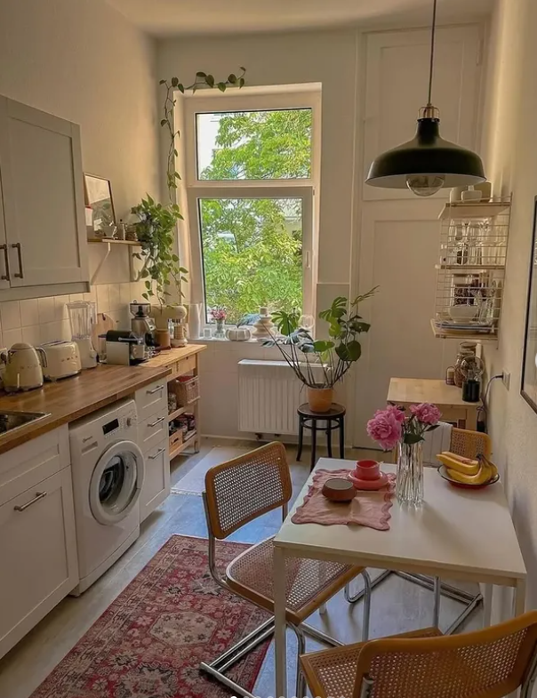 A perfect example of how thoughtful styling can make even a compact kitchen feel warm, homey, and beautifully lived-in.