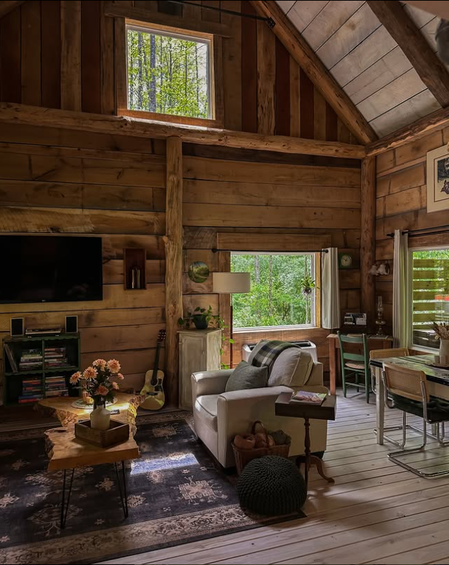 Soft lamplight, vintage accents, and a lived-in rug create a comforting space perfect for slow mornings, reading by the window, or unwinding after an adventure in the woods.